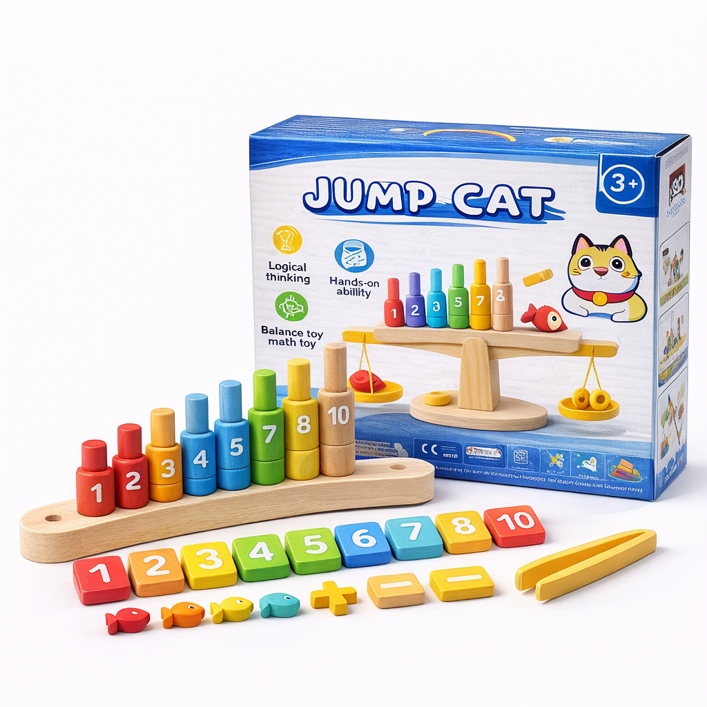 Развивающая деревянная игрушка «Jump Cat» — это обучающий балансир с функцией счёта, который помогает ребёнку легко освоить основы математики через игру. Игрушка выполнена из натурального дерева, имеет яркие безопасные краски и продуманную конструкцию весов.