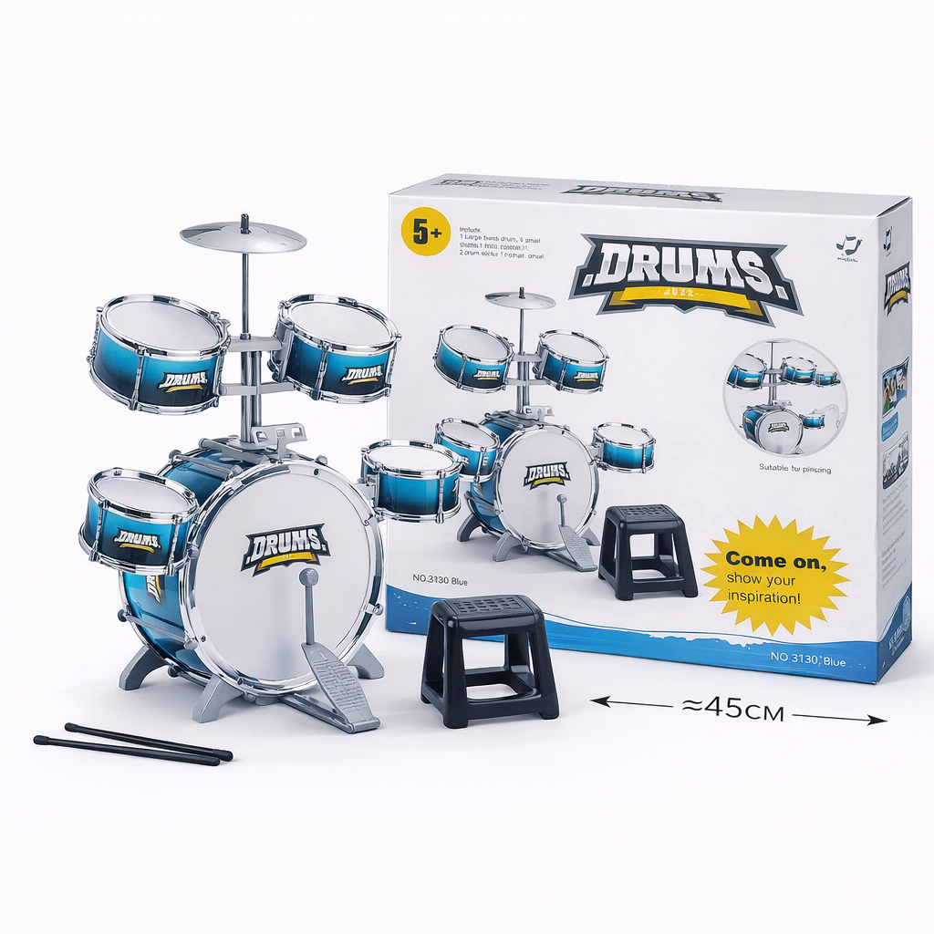 Детская барабанная установка — это полноценный музыкальный набор для развития ритма и творческих способностей ребёнка. В комплект входят барабаны, тарелки, палочки и удобный стульчик. Игрушка помогает ребёнку почувствовать себя настоящим музыкантом, развивает слух, координацию движений и чувство ритма.
