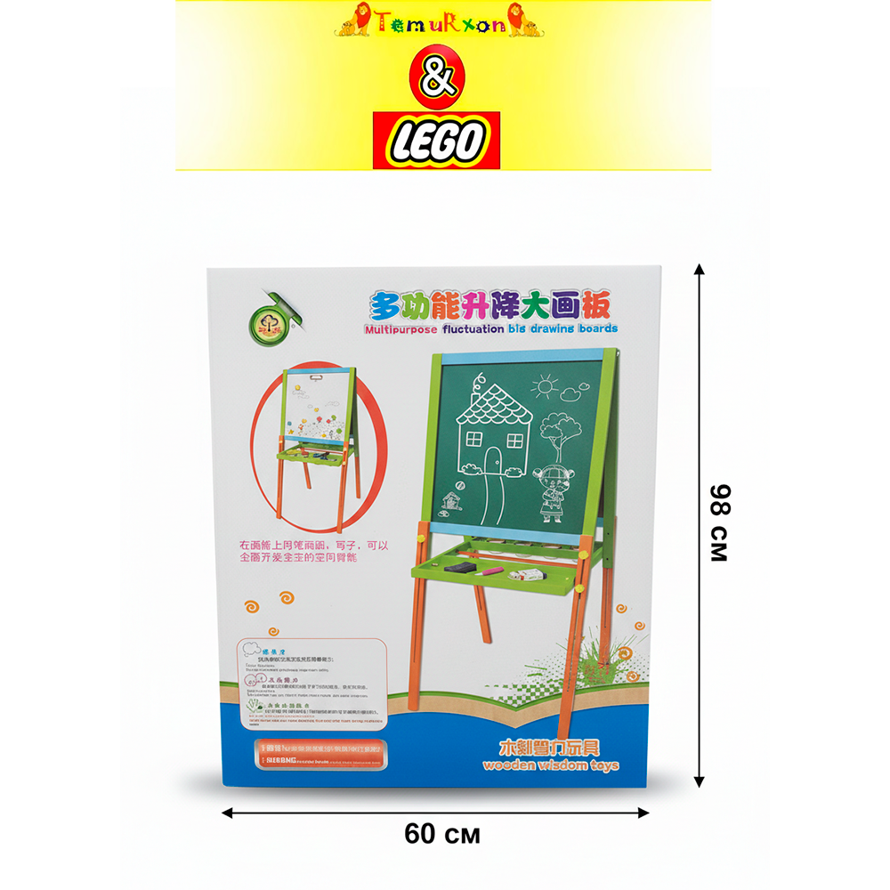 Детская двусторонняя доска-мольберт для рисования и обучения. Устойчивая конструкция, полка для аксессуаров и удобный формат для творческих занятий.