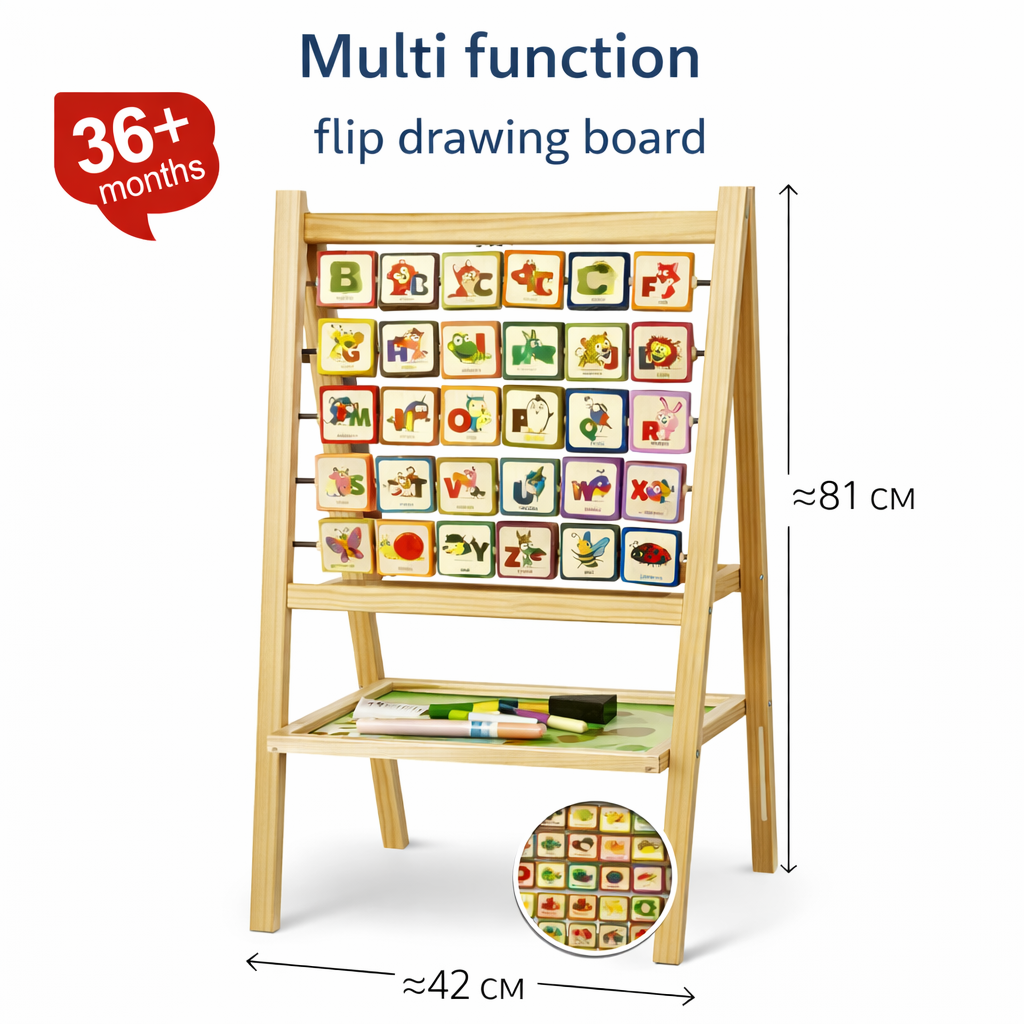 Многофункциональная обучающая доска, которая помогает детям изучать буквы английского алфавита, животных и предметы в игровой форме. Карточки вращаются, позволяя ребёнку изучать буквы и соответствующие картинки.