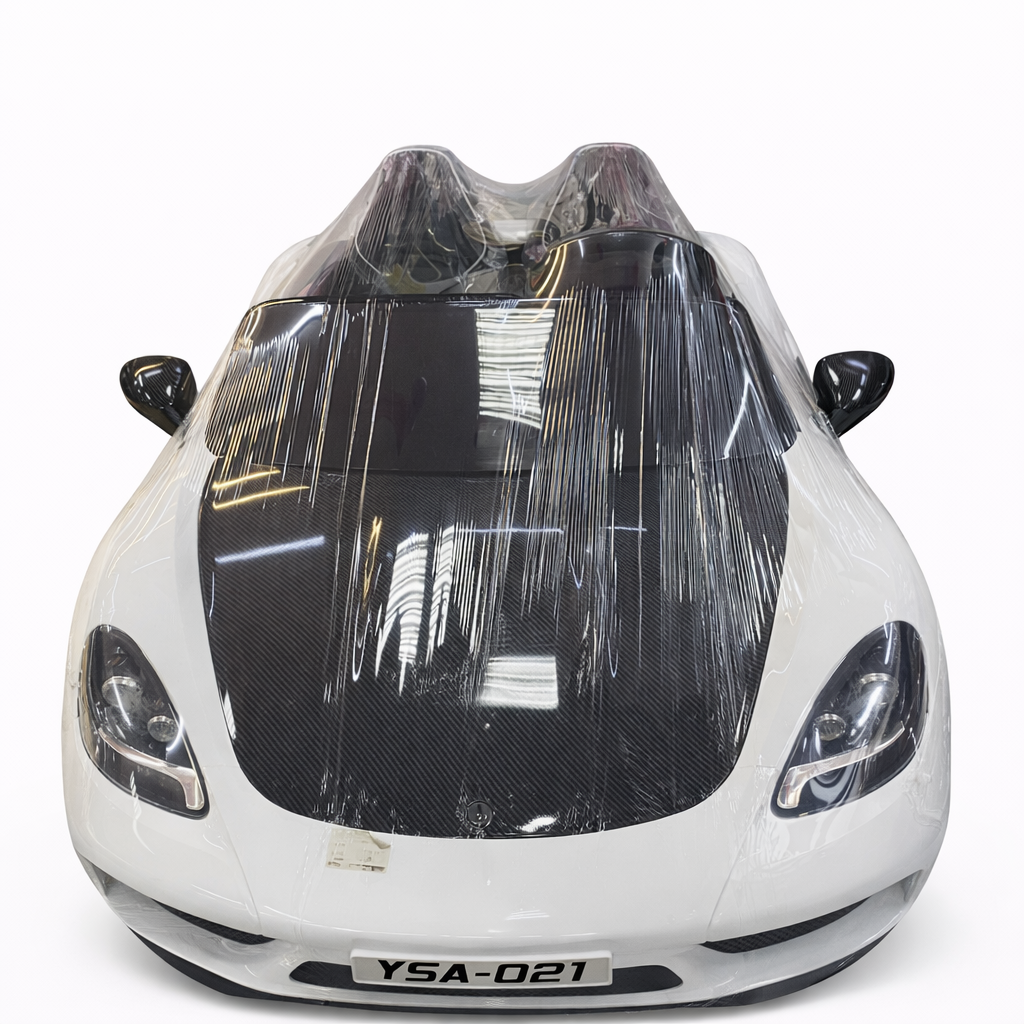 Детский электромобиль в виде спортивного автомобиля — эффектная и реалистичная модель для активных игр. Дизайн выполнен в стиле современного спорткара: низкая посадка, выразительные фары, зеркала заднего вида и контрастный капот с карбоновым эффектом.