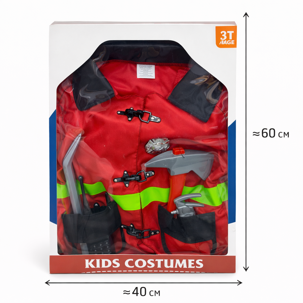 Карнавальный костюм пожарного с инструментами. Подходит для утренников, ролевых игр и фотосессий.