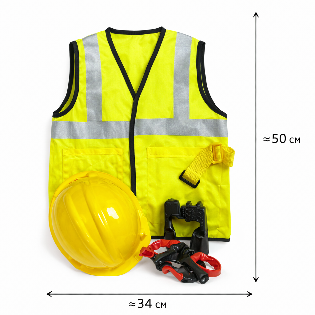 Детский костюм строителя — тематический игровой комплект для маленьких мастеров. В набор входит яркий сигнальный жилет со светоотражающими полосками, защитная каска и игрушечные инструменты.