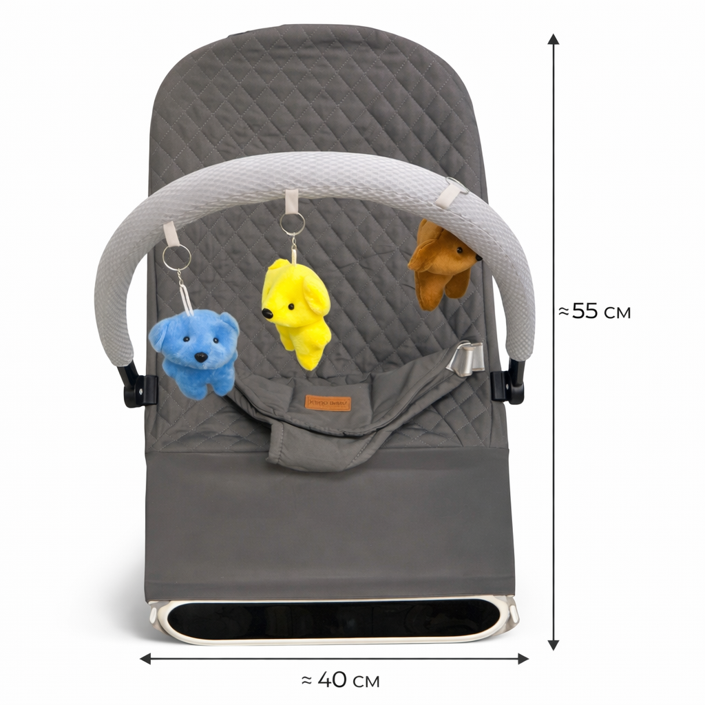 Компактный детский шезлонг 40×59 см с мягким сиденьем, дугой с игрушками и функцией качания. Подходит для малышей с первых месяцев жизни.