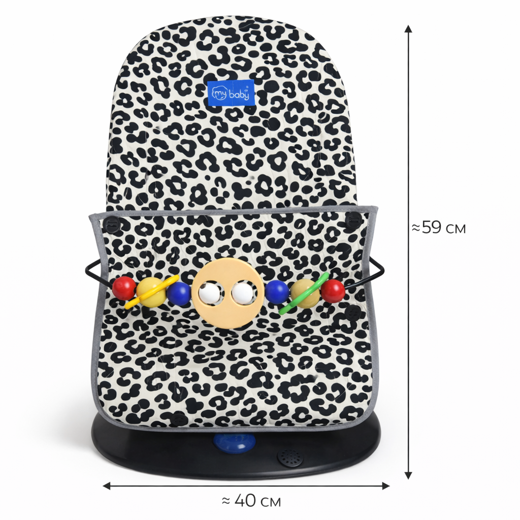 Компактный детский шезлонг 40×59 см с мягким сиденьем, дугой с игрушками и функцией качания. Подходит для малышей с первых месяцев жизни.