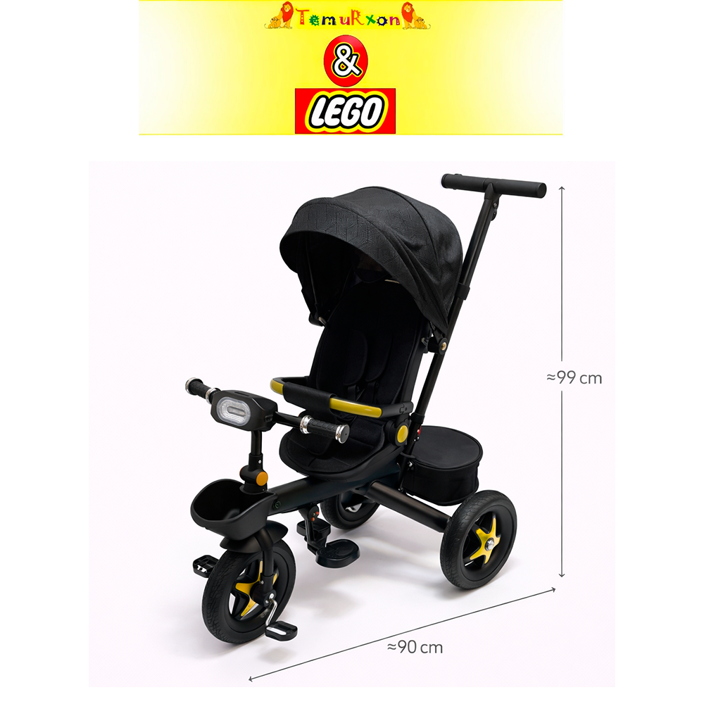 Детский трёхколёсный велосипед-коляска с родительской ручкой, чёрный с жёлтыми элементами