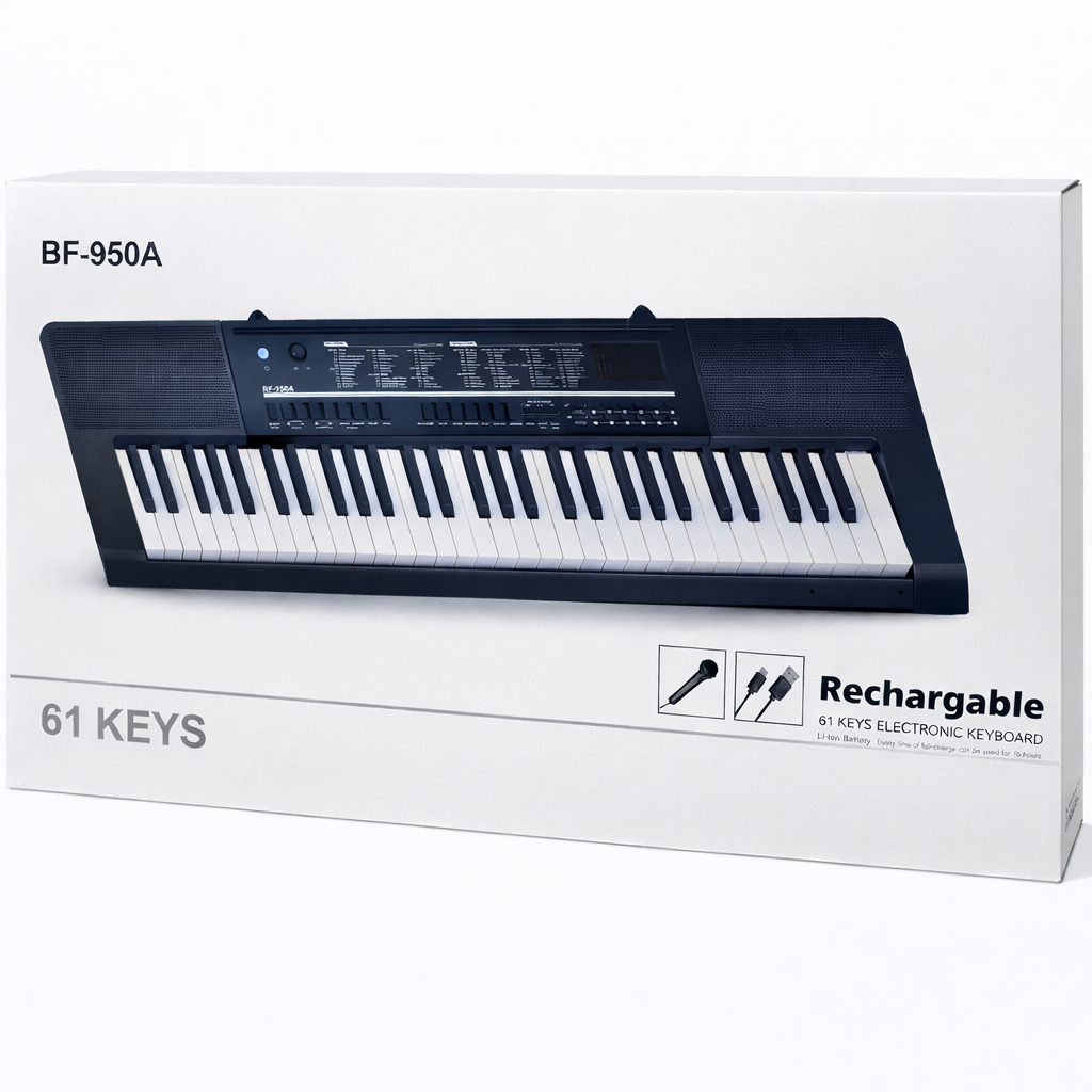 Электронная клавиатура BF-950A с 61 клавишей и перезаряжаемым аккумулятором. Подходит для обучения и домашнего музицирования.