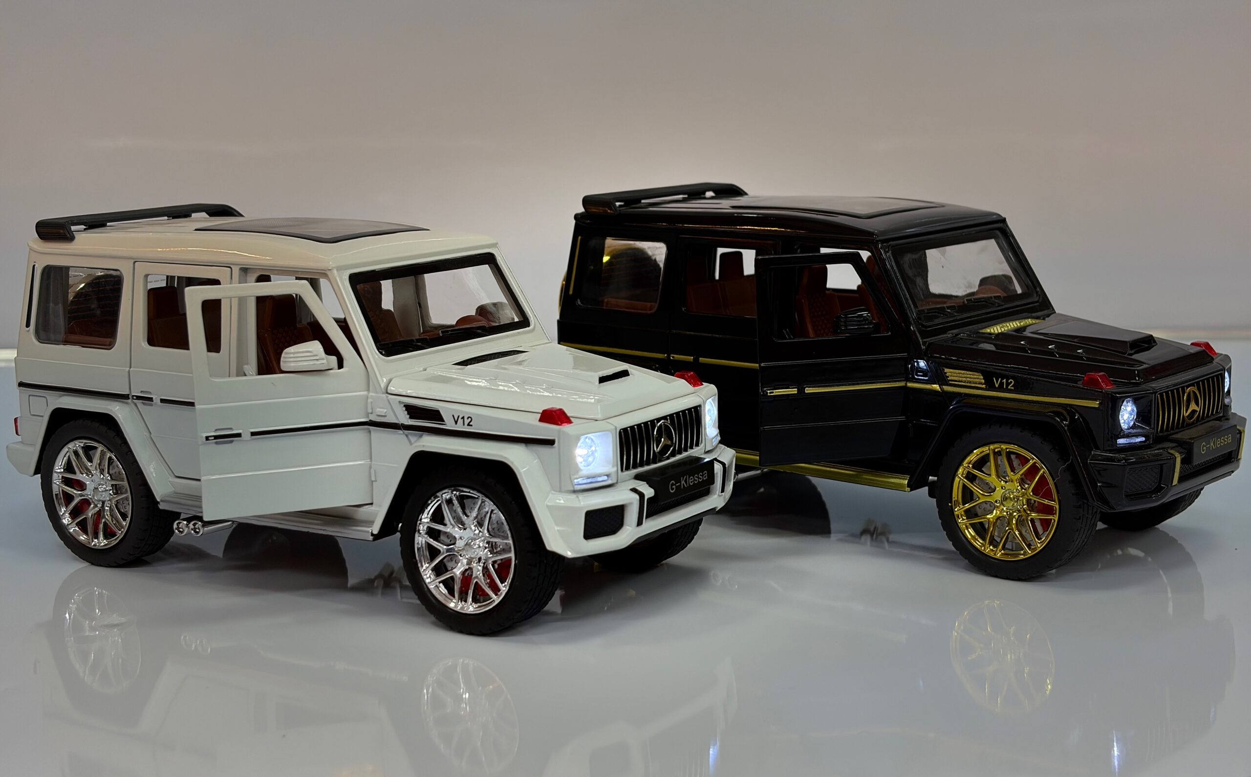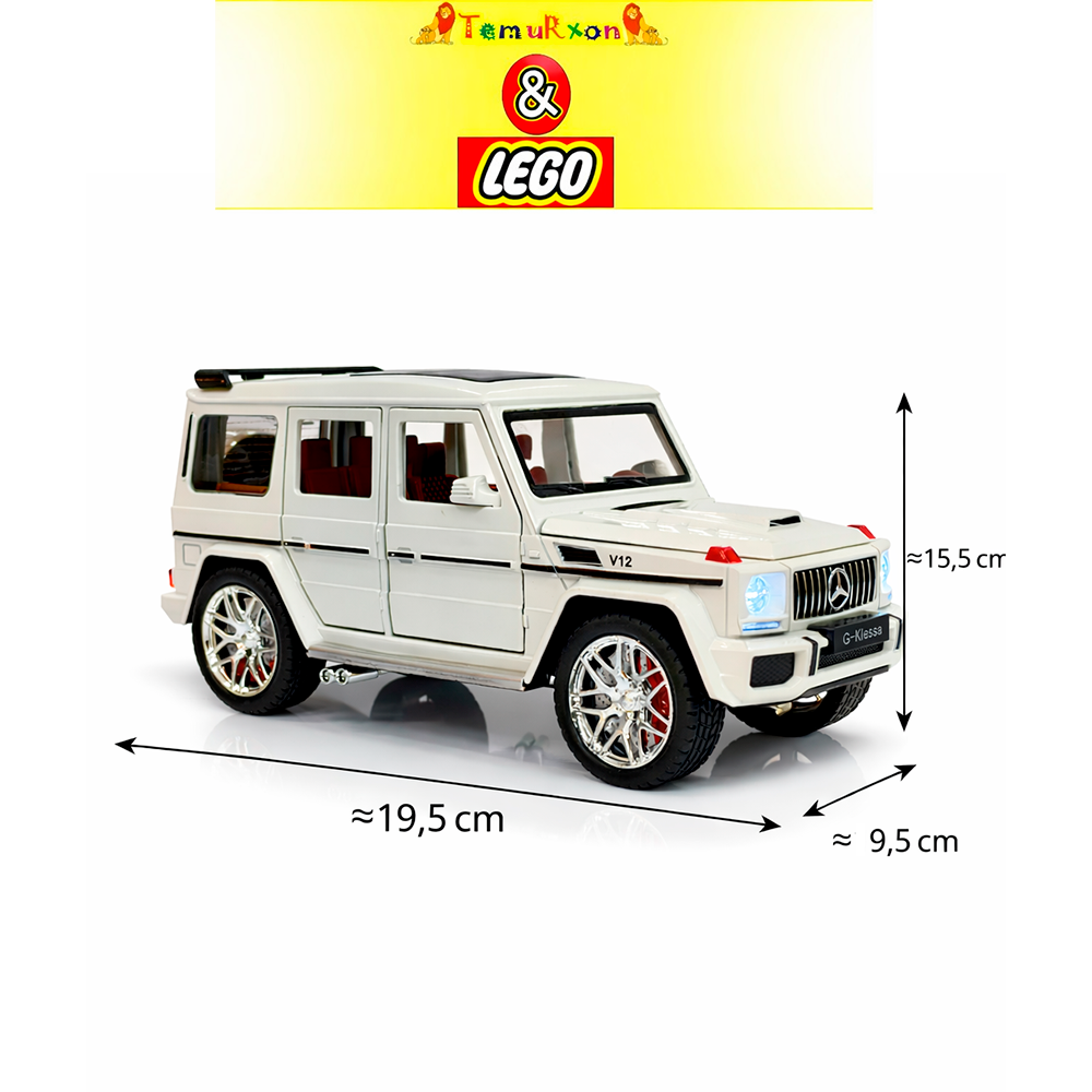 Игрушечный внедорожник выполнен в стиле премиального SUV с высокой степенью визуальной детализации. Модель имеет массивный кузов, хромированные диски, реалистичную решётку радиатора, проработанный салон и светящиеся передние фары. Дизайн вдохновлён классическим внедорожником G-Class и ориентирован на эффектный внешний вид и активную игру.