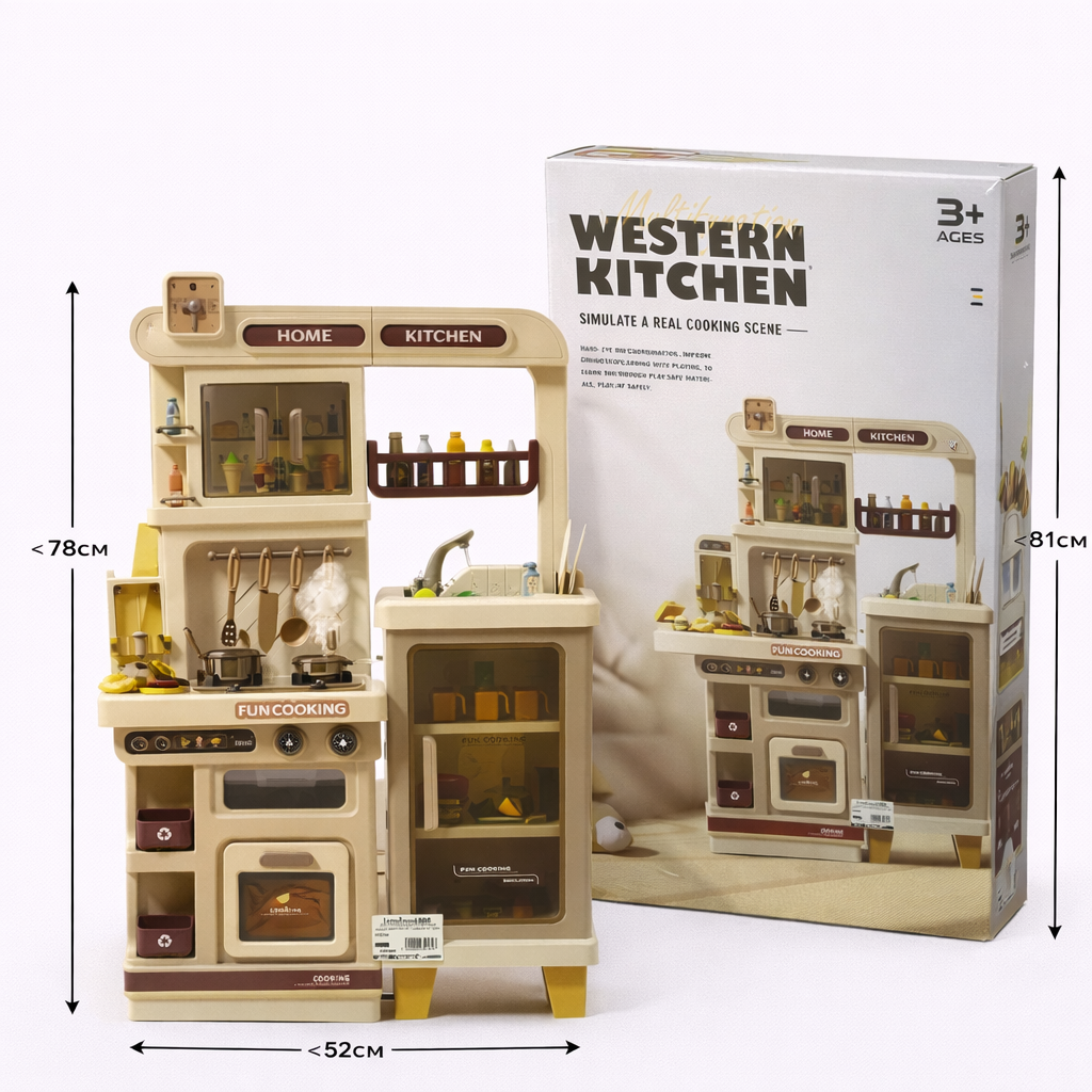 Премиальный внешний вид: Дизайн «Western Kitchen» копирует современные кухонные гарнитуры. Прозрачные дверцы шкафчиков, имитация микроволновой печи и стильные поворотные ручки создают ощущение «взрослой» кухни.