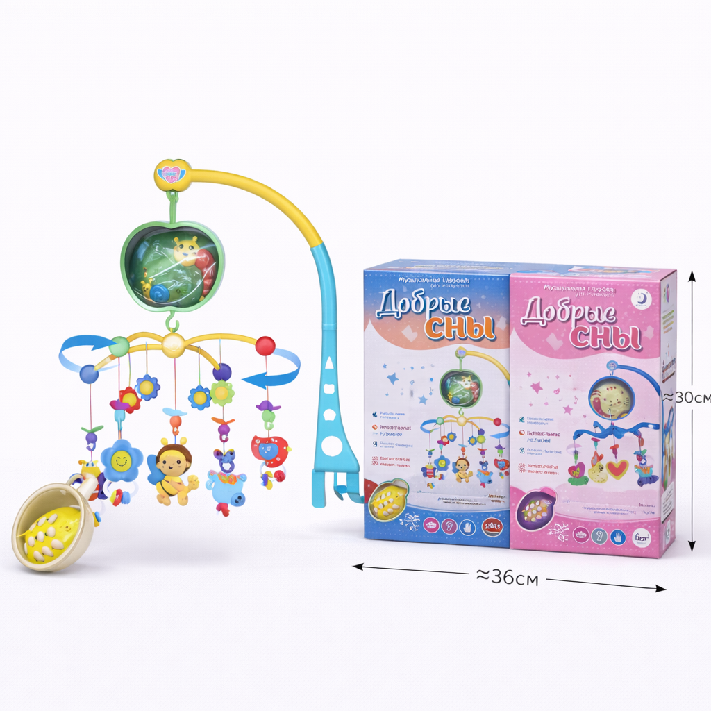 Музыкальный мобиль «Добрые сны» с вращающейся каруселью — это универсальная игрушка для новорождённых, которая сочетает в себе музыку, движение и яркие элементы. Подвесные игрушки плавно вращаются, создавая успокаивающий эффект и помогая ребёнку быстрее засыпать.