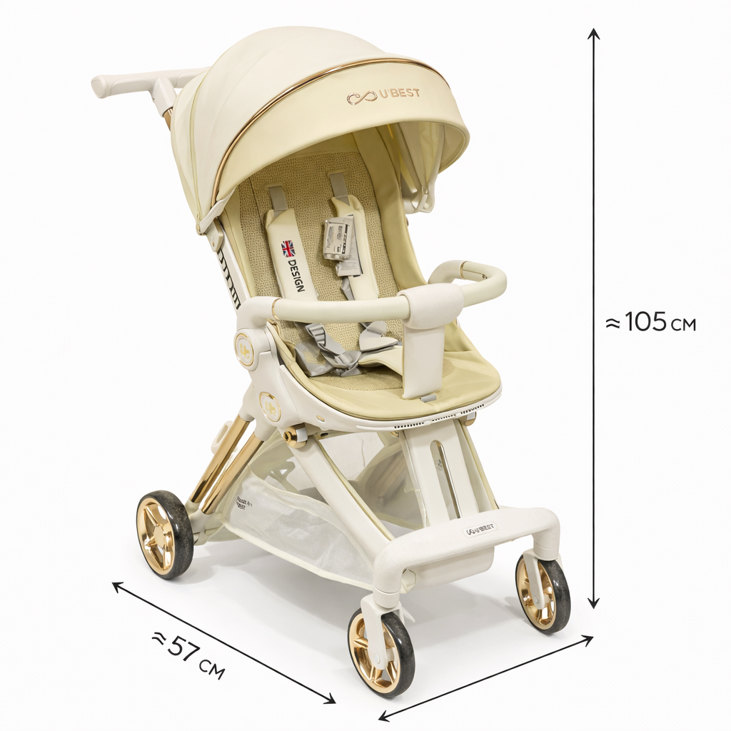 Ubest Premium Cream — современная городская прогулочная коляска с премиальным дизайном и компактными размерами. Высота ≈105 см обеспечивает удобство управления, а ширина ≈57 см позволяет легко проходить в лифты и узкие проёмы.