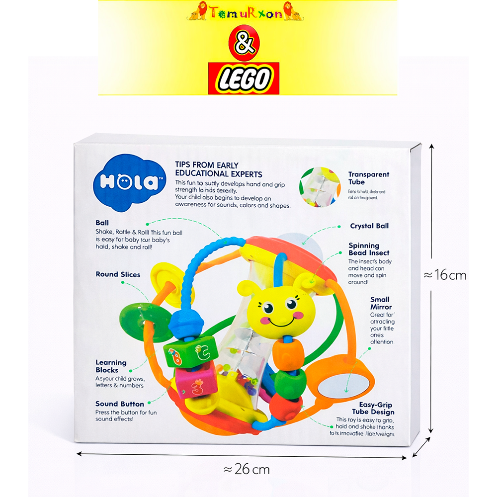 Hola Multi-Activity Ball — многофункциональная развивающая игрушка для малышей, предназначенная для захвата, тряски и перекатывания. Конструкция включает прозрачную трубку с элементами внутри, вращающиеся бусины, зеркальце и звуковую кнопку.