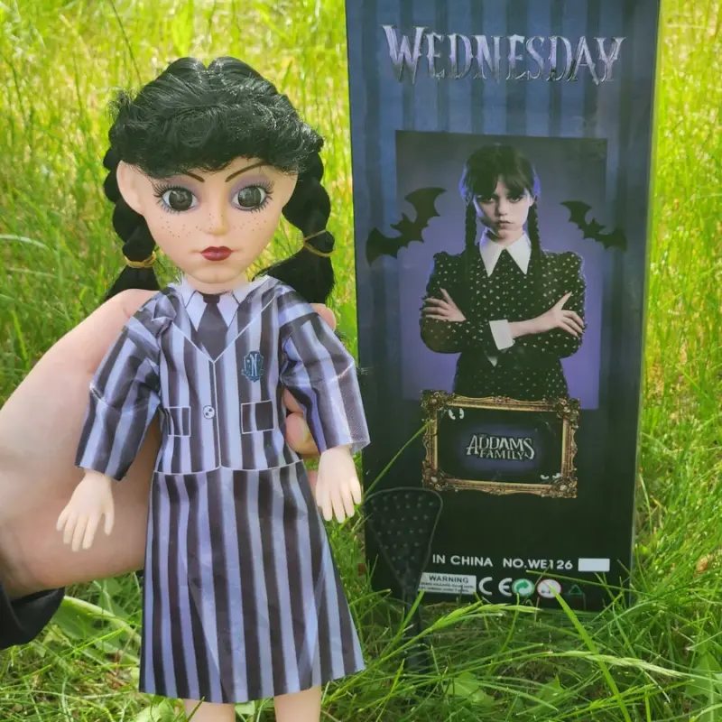 Кукла главной героини сериала Уенсдей. Кукла музыкальная, поет известную песню из сериала Уэнсдей. Кукла в сочетании с ярким воображением ребенка подарит много часов увлекательной игры. Также наборы с куклами порадуют и взрослых девушек, женщин для коллекции уникальных кукол. Куклы и аксессуары удобно брать с собой на прогулку, в дорогу, в детский сад или просто играть с друзьями и подругами дома. Детские куклы для девочек качественные, лицо хорошо прорисовано, волосы легко заплести, а одежду легко снять и поменять на другую.